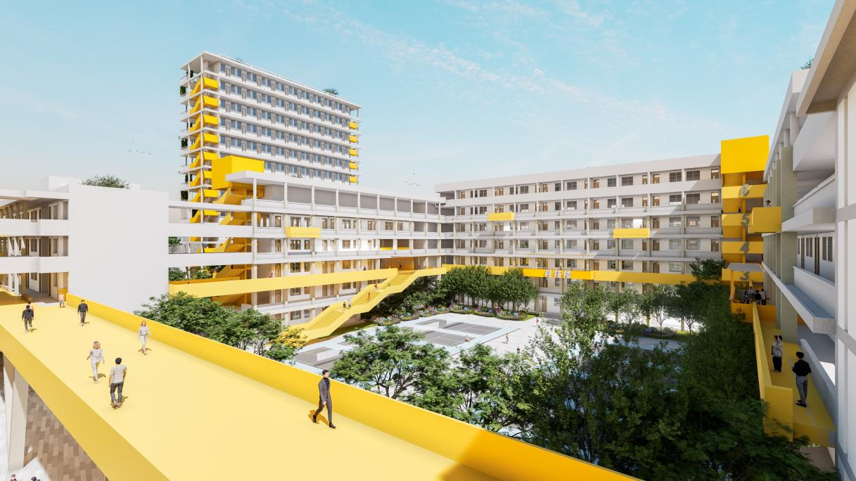 因地處龍崗區(qū)“客韻新城”,毗鄰龍崗河、龍園公園和鶴湖新居客家民俗博物館,周邊交通發(fā)達(dá),生活便利,人口聚集,校園內(nèi)綠樹(shù)成蔭、設(shè)施齊全,擁有良好的打造“綠色校園”“文化校園”的基礎(chǔ)。項(xiàng)目組立足校園現(xiàn)狀,通過(guò)安全評(píng)估、院落織補(bǔ)、空間滲透、連橋搭建等設(shè)計(jì)手法打造多元一體化校園,建成后將為龍崗區(qū)師生提供一個(gè)安全高效、活力創(chuàng)新的高品質(zhì)學(xué)校。